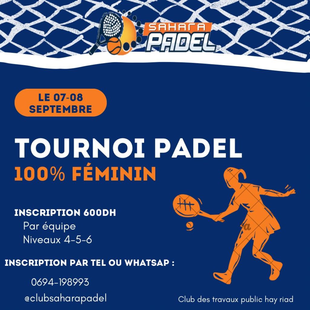 Les joueuses de padel, à vos raquettes ! Le club SaharaPadel, est fier d’annoncer la tenue d’un tournoi de padel exclusivement féminin les 7 et 8 septembre 2024 au club des travaux publics à Hay Riad. Un événement dédié aux femmes Cet événement sportif est une occasion unique pour toutes les passionnées de padel de […]